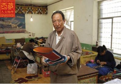 坐在工作臺上的赤列塔青,身材高大,穿一身合體的淺色藏裝,前擺上沾著幾星鼻煙,長期用針的手指有些變形。翻開他的履歷發(fā)現(xiàn),赤列塔青可以說是拉薩少有的制靴世家,他的父親邊巴頓珠在舊社會是個給人支差的貧苦鞋匠,靠給有錢人修鞋、做鞋為生。今年68歲的赤列塔青性格沉穩(wěn)、做事穩(wěn)健,他12歲當(dāng)學(xué)徒工,做鞋做了56年,如果再加上父輩的修鞋歷史,時間更長。在今天的拉薩有這樣經(jīng)歷的人算是屈指可數(shù)了。赤列塔青從小就在父親和師傅身邊打下手,逐漸掌握這個足以養(yǎng)家糊口的一技之長,終于成長為一個勤奮而多才的手工藝人,開始了穩(wěn)坐一隅的匠人生涯。