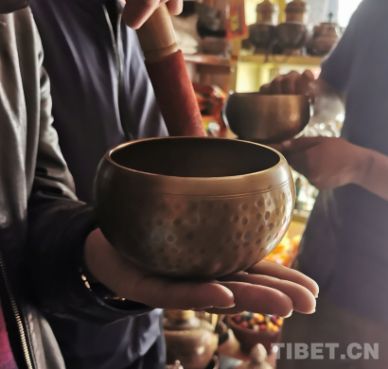 一位店主告訴我,sing bowl在印度和尼泊爾都有,但印度的一般稍大些,尼泊爾的稍小些。我仔細對比了店中的兩種碗,確實如此。同時,有些碗內(nèi)部有紋飾,外部也有相應簡易圖形的點綴,比如圓形斑點,但有些碗的內(nèi)壁和外壁無任何紋飾。一般有紋飾的價格要稍高一些,價格從200元至350元不等。但分辨sing bowl質(zhì)量最重要的是看其“唱歌”的音質(zhì)與在手上產(chǎn)生震動的幅度,一般以音質(zhì)低沉雄厚為佳,以震動引發(fā)全身共鳴的程度高為好。但我們的現(xiàn)場演示表明,個人使用的技巧也很重要。