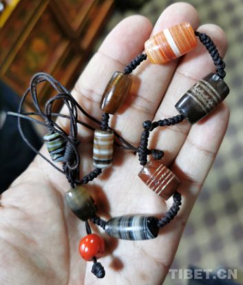 瑪瑙在那里也充滿了神秘感,纏絲瑪瑙尤其如此。但整體上,與天珠相比,纏絲瑪瑙的辨別方法更簡單一些,分類也沒有天珠那樣復雜。在市場中,商家一般只將瑪瑙分成兩類:一類是新瑪瑙,另一類是老瑪瑙。不知是商家不屑,還是缺少消費人群,新瑪瑙在市場中并不多。有天珠,尤其是好天珠的商店多有老瑪瑙,商家更多時候喜歡將二者放在一起銷售。老瑪瑙其辨識標準與天珠相似,只不過瑪瑙沒有“眼睛”之說;纏絲瑪瑙的“纏絲”數(shù)量和形態(tài)一般也不太重要,除非數(shù)量或形態(tài)極為特殊,可能此時最重要的標準就成為“物以稀為貴”了。當然,老瑪瑙的價格一般也較高,多集中于每顆幾千至幾萬元。