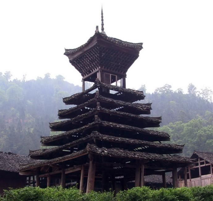看這一座座高聳入云的鼓樓,氣勢(shì)十足,這是侗寨的標(biāo)志性建筑,爬上鼓樓最頂端,便可在侗寨中“一覽眾山小”。鼓樓的造型為杉樹(shù),最初為“遮陰樹(shù)”。古時(shí)在樹(shù)蔭下聚會(huì)議事歌舞娛樂(lè),但樹(shù)蔭不避風(fēng)寒。勤勞智慧的古人便仿杉樹(shù)形狀在寨中建起“堂瓦”,雨能避濕,冷能避寒。