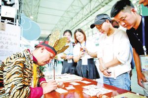在云南文博會(huì)上,來(lái)自麗江的納西族東巴文化傳承人現(xiàn)場(chǎng)展示東巴文字的書寫方法。 張彤?dāng)z