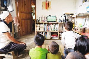 黎友明給孩子們看自己拍的水稻紀(jì)錄片。