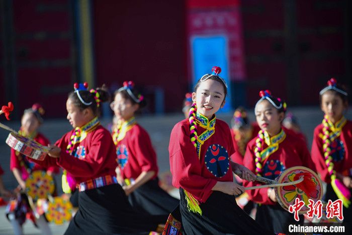 資料圖為西藏自治區(qū)拉薩市城關(guān)區(qū)慈覺林?jǐn)?shù)十名孩子練習(xí)熱巴舞。 記者 貢嘎來松 攝