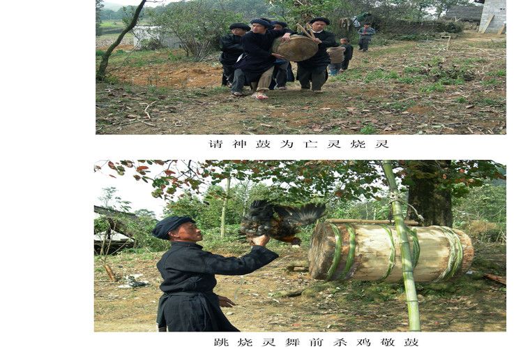 據(jù)苗族民間傳說,楊魯(指苗族祖先)死后,為祭奠他,苗族人民就用楊魯從玉皇大帝那里帶回來的木鼓和蘆笙為他做齋,鳴鼓三聲,吹奏蘆笙震天動地,接楊魯回來燒靈,因此鼓和蘆笙成為苗族人民辦喪事的信物,是神靈的象征,以鼓配唱,以鼓配笙吹跳,久而久之形成了苗族祭祀祖先和為亡靈燒靈開道的祭祀性舞蹈——“燒靈舞”。遠(yuǎn)古時期,苗族是比較強(qiáng)大的民族,苗族的喪葬習(xí)俗,一直受著鬼神觀念的影響,并在意識形態(tài)深處,打下了深刻的烙印。由此可知,苗族“燒靈舞”源遠(yuǎn)流長,以口傳心授方式代代相傳。