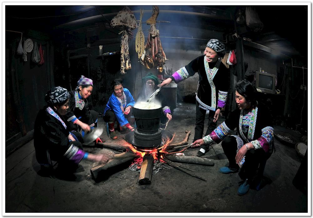 人略施小計,使牛變成草食的家伙,省了口糧。人覺得這樣做對不起牛,所以仍讓牛住樓下老地方,一直住到現(xiàn)在;而且每年四月初八都蒸黑糯飯,殺雞宰鴨過黑飯節(jié),趁機(jī)給牛優(yōu)待,開膳時抓一糰黑糯米飯供牛受用,有福同享,略帶“努都弱沙”澀味的染色飯食,不但別有一番風(fēng)味,還有祛濕消滯清熱的效能哩,營養(yǎng)藥效兼而有之,對人對牛的健康都有好處;還特別給牛預(yù)備一捆綠油油的嫩草,有的人家還將一把嫩草吊掛于牛欄門口供牛作節(jié)食。這事著實令人感動,肚有墨水的人給它起了個雅致的名號叫?;旯?jié),意為牛是有靈魂的,它有恩于人,應(yīng)該三牲享祭,給牛安魂,替牛定魄,并在牛欄兩邊門縫和門口地面焚插鳧鳧香炷,牛欄門頭貼一片到幾、三五片巴掌般寬、七八寸的長方形的紅紙,這玩藝不規(guī)則地染印顆顆金星,下垂一端呈鋸齒狀,微風(fēng)吹來“皮皮婆婆”地拂動,像一團(tuán)熱烈跳動的火焰,祈求上蒼保佑牛像這紅紅的火焰一樣,祈求上蒼保佑牛健壯興旺。
