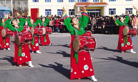 長(zhǎng)鼓舞是朝鮮族代表性的舞蹈之一,脫胎于傳統(tǒng)的“農(nóng)樂舞”。長(zhǎng)鼓分為長(zhǎng)鼓、舞蹈長(zhǎng)鼓、兒童長(zhǎng)鼓和幼兒長(zhǎng)鼓等幾種。形狀是兩頭粗、中間細(xì),左邊鼓筒直徑比右邊鼓筒直徑大1厘米,右邊鼓皮薄,左邊鼓皮厚。