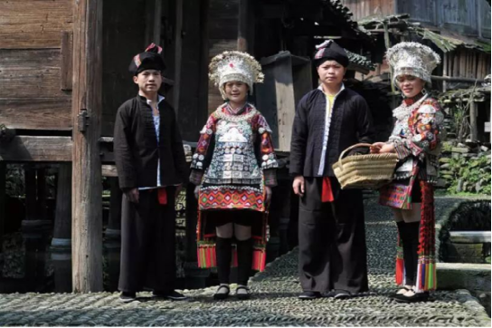 西江型盛裝,系長裙服飾上裝分內層和外層款式為交襟大領衣,領向后傾衣袖、衣襟、衣領為刺繡裝飾部位圖案多為雙頭龍、蝴蝶媽媽宗廟及各種花、鳥、魚、蟲等