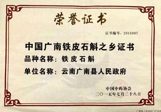 2015年7月28日,廣南鐵皮石斛被中國(guó)中藥協(xié)會(huì)授予“中國(guó)廣南鐵皮石斛之鄉(xiāng)”證書。(凌埡公司提供)