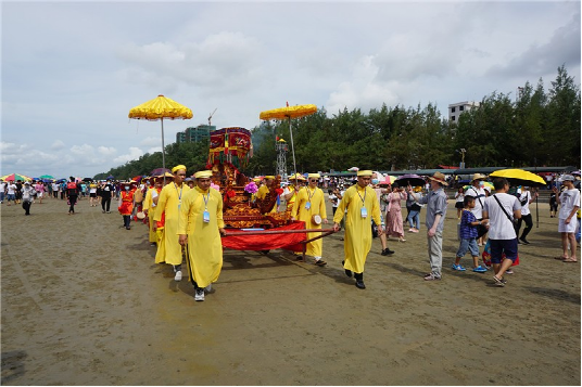 今年適逢中國共產黨成立100周年,活動當天,氵萬尾村洋溢著濃濃的愛國熱情?;顒娱_始,身著京族服飾的當?shù)卮迕駠墼谄鞐U前,舉行升國旗奏國歌儀式。隨后迎神隊伍在鑼鼓和鞭炮聲中到達海邊,將“海神”迎回哈亭敬奉,祈求人畜興旺,五谷豐登(見圖)。眾多慕名而來的區(qū)內外游客集聚哈亭和海邊,與京族同胞一起歡慶這盛大的節(jié)日。