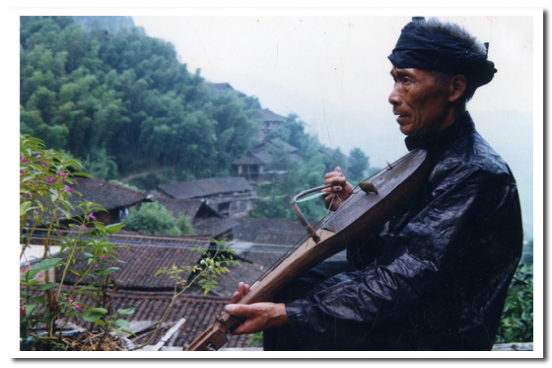 果哈是苗族唯一的古老的民間弓弦樂器,因其形似瓢,故苗語稱之為果哈(意即瓢琴),是唱古歌時不可缺少的伴奏樂器,一般以歌師自拉自唱為主。制作工藝比較粗糙,先選一段長60厘米、直徑為15厘米左右的鴨腳木或泡桐木制成琴身,在其二分之一的一端剜成瓢狀,封住薄板作共鳴箱。另一端修成琴柄,在琴柄頂端鉆孔安琴鈕,用棕繩、牛筋作琴弦,用竹片和綜絲制成弓。琴置兩弦,演奏時以人的唾液代替松香,演奏者時而將弓毛放入口中,讓弓毛增加溫度,增強與琴弦的磨擦,使之發(fā)音。果哈音量微弱,發(fā)音低沉,但音色獨特,與苗歌語調(diào)相當(dāng)協(xié)調(diào),較適合表現(xiàn)安靜、深沉情緒,故常為苗族敘事古歌伴奏。