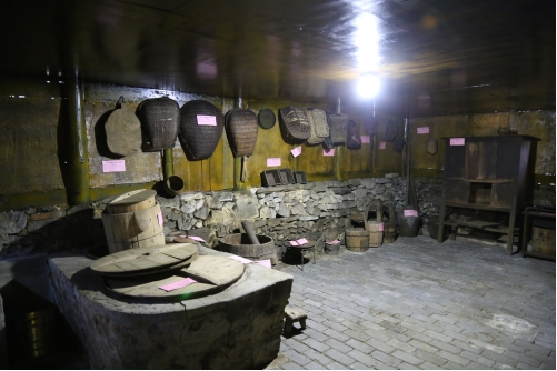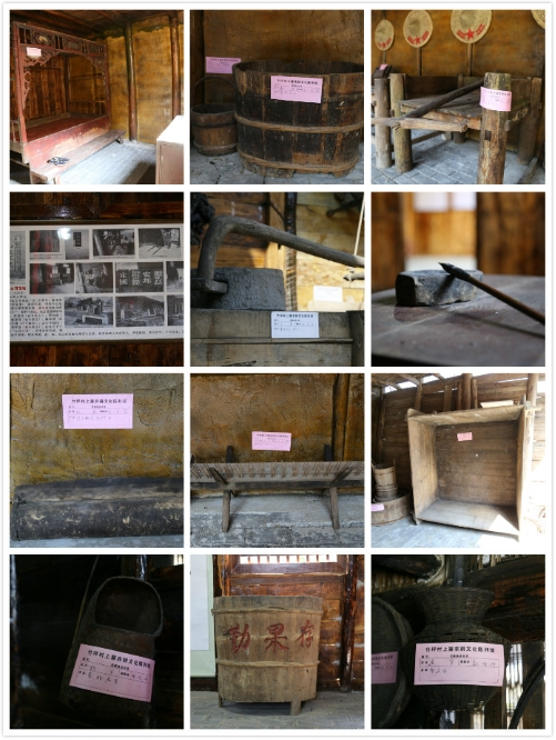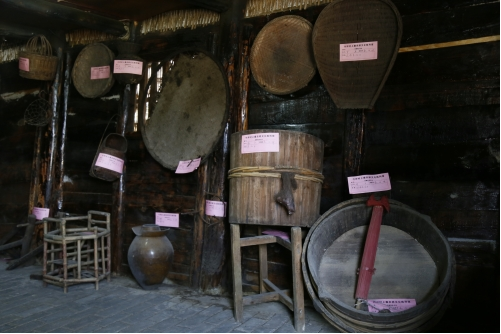 “農(nóng)耕文化陳列館”是由兩棟傳統(tǒng)的木質(zhì)民房改建,從大門進來,門的兩邊放置有農(nóng)具,右側(cè)一個是存儲糧食的倉庫,沿著倉庫邊上的石階往上走,從小門進去,大大小小的簸箕、飯甑、貓籮、魚籮等農(nóng)具應有盡有。