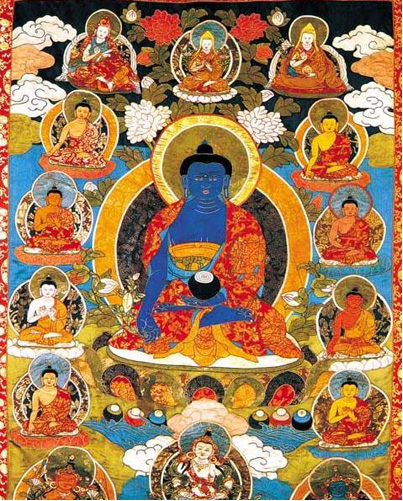 堆銹是青海塔爾寺獨(dú)創(chuàng)的一種藏族繪畫藝術(shù)形式,屬唐卡中的“國(guó)唐”。其制作特點(diǎn)是用各色質(zhì)地不同的綢緞綾羅剪出人物形狀和各種圖案形狀,然后在形象或圖案背后充塞羊毛、棉花等物,再逐一繡在黑色底子的大幅布幔上,使畫面產(chǎn)生出豐富而生動(dòng)的立體感和織物特有的肌理感,具有淺浮雕式的藝術(shù)效果。