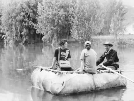 據(jù)當(dāng)?shù)厝私榻B,牛皮船構(gòu)造簡(jiǎn)單,用木頭做船架、牛皮做船體。首先采用比較堅(jiān)硬有彈性的樹(shù)木來(lái)做骨架,然后把牦牛皮泡在水里,將皮上的毛和肉全部去掉后,用四張牛皮并對(duì)縫起來(lái),趁牛皮軟時(shí)包在骨架上,同時(shí)用牛皮繩子捆緊繃好、曬干、擦油定型,再在牛皮接頭處采用牛、羊油來(lái)堵住縫口密封好,避免進(jìn)水。