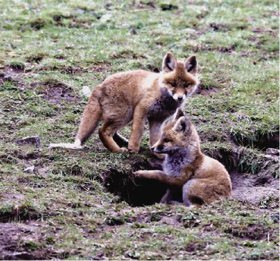 藍(lán)天白云,微風(fēng)輕漾;草地碧綠,鳥語花香。大自然的美景圖正在小赤狐的家園四周徐徐展開。在膽大的小赤狐的叫喚聲里,躲在洞內(nèi)的另外兩只小赤狐也壯著膽子探出頭來。不一會(huì)兒,它們習(xí)慣了周圍的環(huán)境,三只小赤狐在離洞口5米遠(yuǎn)的范圍內(nèi)嬉戲玩耍著。它們時(shí)而跳躍,時(shí)而奔跑,展現(xiàn)出本能的捕獵動(dòng)作。稍大一點(diǎn)的小赤狐騎在小一點(diǎn)赤狐的背上嬉戲玩耍,小赤狐也不示弱,奮力反擊,猶如兒童打鬧,其樂無窮。那烏黑溜圓的眼睛彎了又彎,毛茸茸的尾巴高高地翹起,身體嬌小,惹人喜愛,讓人看了會(huì)產(chǎn)生想上去抱一抱、摸一摸小赤狐身軀的念頭。