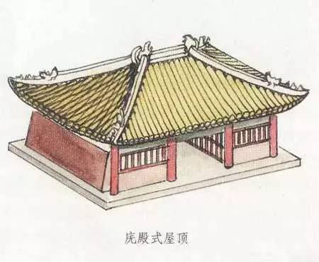 根據(jù)資料與記載,廡殿頂屋頂早在殷商時代就已出現(xiàn)。不過,現(xiàn)在對唐代中期以前的廡殿式屋頂?shù)木唧w結(jié)構(gòu)已無從得知,晚唐以后漸有實(shí)例可查。其形象是屋面平緩,正脊較短。正脊兩端為鴟尾而不是鴟首。