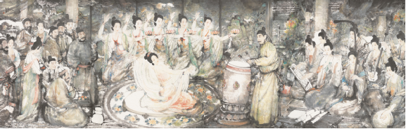 劍器舞也有著悠久傳統(tǒng),早在春秋戰(zhàn)國(guó)時(shí)代,孔子的學(xué)生子路,戎裝見孔子,曾拔劍起舞。學(xué)生拜見老師舞劍,當(dāng)然只是表演技藝,是對(duì)老師致敬的意思。湖北隨縣戰(zhàn)國(guó)初期曾侯乙墓出土的鴛鴦盒上的樂舞圖案中,鼓旁的舞者腰間掛著短劍,說明劍舞可能是當(dāng)時(shí)頗為流行的一種舞蹈形式。楚漢相爭(zhēng)時(shí),劉邦、項(xiàng)羽宴于鴻門,項(xiàng)莊說:“君王與沛公飲,軍中無(wú)以為樂,請(qǐng)以劍舞。”項(xiàng)羽表示同意,于是項(xiàng)莊拔劍起舞,逐漸靠近劉邦,企圖借機(jī)殺死劉邦,在場(chǎng)的項(xiàng)伯見劉邦危急,也以劍伴舞,保護(hù)劉邦不被項(xiàng)莊殺害。這個(gè)故事表明,當(dāng)時(shí)筵宴中有舞劍作為助興表演的風(fēng)俗。唐代,杜甫作《故武衛(wèi)將軍挽歌三首》,有“舞劍過人絕”句??梢姰?dāng)時(shí)許多人會(huì)舞劍,而且各有絕招。公孫大娘最為擅長(zhǎng)的《劍器舞》,是《裴將軍滿堂勢(shì)》。杜甫曾觀其舞,并寫了《觀公孫大娘弟子舞劍器行》一詩(shī),觀者如山,可見此舞技巧之高。