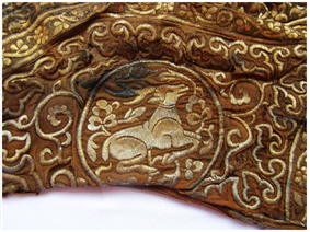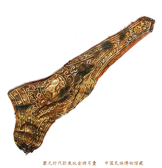中國民族博物館館藏的臥鹿紋金繡弓囊通長72CM,最寬處25CM,最窄處6.5CM。面料為絹地,呈深褐色。專家推斷其入土前應內襯樺樹皮或獸皮類框架。弓囊正面以銀裹金錢繡滿圖案,整體金碧輝煌。由于埋藏地下數(shù)百年,弓囊兩端的鐵質穿環(huán)和皮條已銹蝕腐爛。