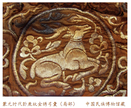 如果說在回回織工梭下的納石夫圖案總是帶有濃郁的伊斯蘭風情,而我們在這只金繡撒袋上見到的臥鹿紋,則已是純粹中國特色的春水題材了。它是出自一位已經深受中華文化濡染的回回繡女之手?還是一位已是織金高手的中原繡娘穿針引線完成了它?不論怎樣,在文化大交流、民族大融合的時代里,這只金繡撒袋顯露出中西文化合璧一體的氣息。