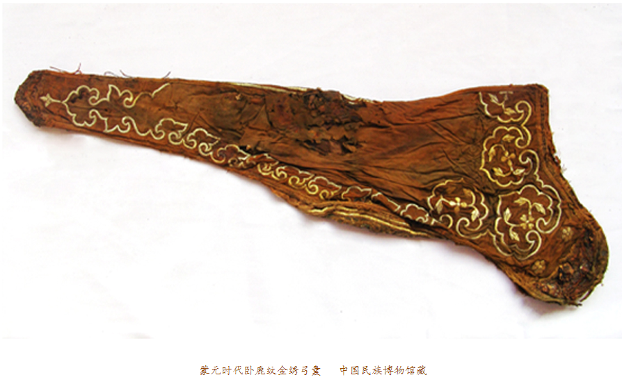 我們曾經描述過元代納石失生產的空前絕后。蒙古民族把對于黃金的寶愛,傾泄進元朝一百年的歷史時空。在整個13世紀的每一個歷史篇章,都鐫刻著納石失的金縷光影。我們在史料里看到,天子之衣是納石失,天子之裳是納石失,天子之履依然是納石失。那么,蒙元一代,還有什么是用黃金絲線耗盡心血織繡而成的呢?現(xiàn)在,我們看到了這只金繡弓囊。
