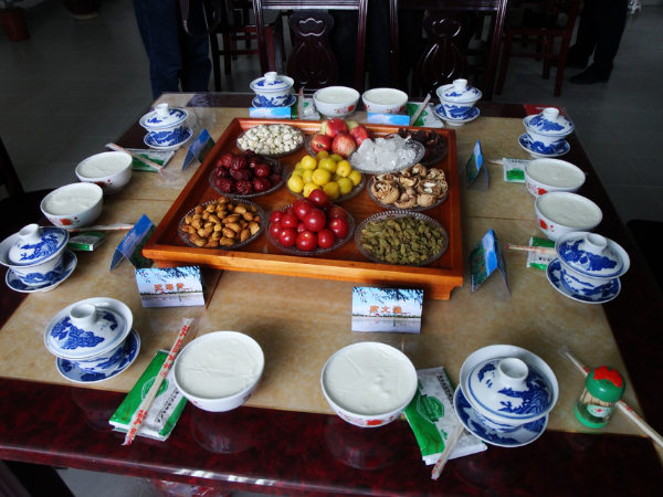回族普遍喜歡飲茶。回族先民喜食甜品,在中國茶文化影響下,形成了以甜味為特色的飲茶習(xí)慣。飲茶之風(fēng)興起于中國晉代,盛于唐代以后,隨之出現(xiàn)了茶具,其中以包括茶托、茶碗、碗蓋的“三坯胎”蓋碗美觀實用?;刈謇^承發(fā)展了這種茶文化,形成了以“三炮臺”為茶具的“八寶蓋碗茶”:在茶具中放入茶葉(茉莉花茶、陜青茶、紅磚茶、窩窩茶、毛尖等)、糖(白糖、紅糖、冰糖、梨膏糖等)及紅棗、核桃仁、桂圓肉、芝麻、葡萄干、枸杞(或柿餅、山楂、姜片、果干)等配料,用開水沖制后飲用。茶葉及配料在不同的地區(qū)、不同的季節(jié),根據(jù)飲茶者的身體狀況與喜好有不同的搭配,如“紅糖磚茶”“冰糖陜青茶”“三香茶”(茶葉、糖、桂圓)、“白四品”(陜青茶、白糖、柿餅、紅棗)、“紅四品”(磚茶、紅糖、紅棗、果干)、“五味茶”(綠茶、山楂、芝麻、姜片)等。八寶茶具有生津解渴、開胃健脾的作用,放入不同的茶料,又具備了不同的健身康體功能。