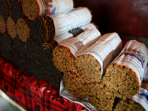 當(dāng)?shù)厝私榻B說:制作藏香的原材料和制作工序要求極其苛刻。由于藏香最主要的用途是用在宗教禮儀上,所以在制作過程中要求一切都要以圣潔為主,否則會被視為是對神靈的不敬。傳統(tǒng)的藏香原材料繁多而復(fù)雜,一般是柏樹樹干為主料,再以藏紅花、麝香、白檀香、紅檀香、紫檀香、沉香、豆蔻、穿山甲、甘菘、冰片、沒藥等幾十種香料按適當(dāng)比例配合主料搓揉而成。據(jù)了解,用于制作藏香的主料柏樹干,在吞巴村這樣高海拔的地方并不生長,從古至今,村民都要從400多公里外的林芝縣運(yùn)過來了,而制作藏香的部分輔料甚至要從印度引進(jìn)。