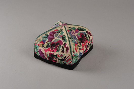 “曼甫朵帕”此款花帽是由手工刺繡成的,四瓣以帽頂為中心拼接縫合,套模成型,以黑絨鑲邊,四棱可折疊。每一瓣三角形內(nèi)以一個或兩個單獨紋樣,一條邊緣紋樣構(gòu)成一組適合紋樣,這種紋樣簡練、構(gòu)圖嚴謹?shù)幕眻D案稱為單獨適合紋樣花帽,維吾爾語稱“曼甫朵帕”。此花帽紋樣大都是以新疆花卉、果實等自然形態(tài)為素材,加以藝術(shù)的提煉、概括、夸張、變化而使之成為具有濃郁鄉(xiāng)土氣息和強烈民族情趣,圖案有花卉、果實,造型有石榴花、桃花、杏花、麥穗,還有星月、雪花等。此外還大量運用了富有變化的幾何圖案。布底為一色平線,圖案則用優(yōu)質(zhì)彩色絲線混合棉線刺繡而成,形成底色和花色對比強烈,艷麗奪目。