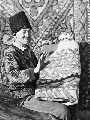 這時(shí),亞生已經(jīng)開(kāi)始了第二步,他把彈好的羊毛鋪勻,開(kāi)始噴灑開(kāi)水。只見(jiàn)他熟練地把水噴向羊毛,然后和妻子一起快速把簾子卷好,用羊毛繩綁緊,再用腳踏著卷好的簾子在平地上來(lái)回踏蹬,這樣不停地重復(fù)后,做成了氈坯。亞生停下來(lái)解開(kāi)簾子,拉平氈坯,修整好邊角,又灑上熱開(kāi)水,把氈坯卷起,這是工藝最關(guān)鍵也是最后一步——他們一起跪在簾上,用雙臂反復(fù)搓滾氈坯,感覺(jué)已經(jīng)平整了,夫婦倆又齊心協(xié)力把氈坯展開(kāi)拉平,放到院子里。此時(shí),亞生長(zhǎng)出了一口氣,抹抹頭上的汗說(shuō):“晾干了就可以賣了!”