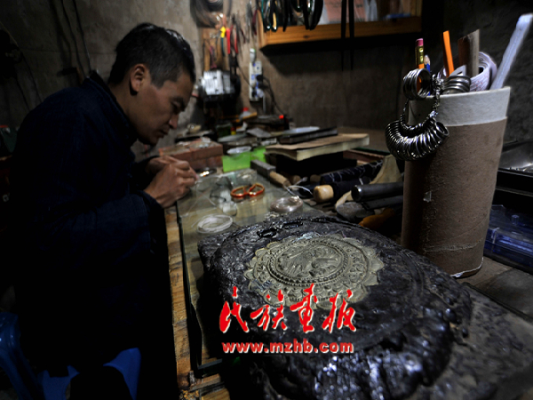 將事先手工打磨好的銀絲擺放在需要鑲嵌的位置,然后用焊槍整體加溫。該過程需要嚴(yán)格控制溫度,溫度高則熔斷銀絲,溫度低則鑲嵌不牢固。制作過程最難把握的是鏨刻與焊接。鏨刻的掌握全憑手上的感覺,用力過大容易將銀片鏨通,力道不夠又不能將紋理的層次感突顯,這是檢驗一個銀匠師傅技藝是否成熟的標(biāo)準(zhǔn)之一。