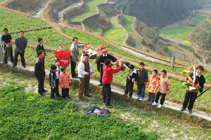 不一會(huì)兒,浩浩蕩蕩的娶親隊(duì)伍沿著田埂走過(guò)來(lái)了。看見(jiàn)路邊擺放的東西,他們就在衣服上面留下了糯米飯、雞肉之類(lèi)的食物。