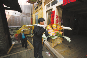 新娘離開(kāi)娘家時(shí),女方不僅要送單數(shù)的雞、鴨,如5、7、9只,就連給男方所挑的陪嫁品擔(dān)子也必須是單數(shù)的。