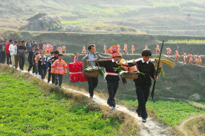 婚禮那天,娶親隊(duì)伍必須很早就上路。領(lǐng)頭的是娶親人(必須是家庭條件好、有威望的成年男子),他要帶上一支鳥(niǎo)槍或一把古戰(zhàn)刀,一方面表明“我是來(lái)娶親的”,同時(shí)也是為了避邪保平安。而這刀、槍會(huì)在進(jìn)門(mén)后由女方家接下,儀式結(jié)束后再退還。