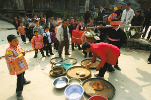 我們尾隨著娶親隊(duì)伍進(jìn)寨,發(fā)現(xiàn)寨子中間的路上也擺著很多簸箕、臉盆之類(lèi)的容器,原來(lái),村民們也要“討賞”呢!聽(tīng)高邦寨的村支書(shū)說(shuō),遇到這種情況,路人放的東西越貴重,娶親隊(duì)伍留下的肉食就越豐盛,有時(shí)甚至?xí)畔乱徽浑u或鴨呢!