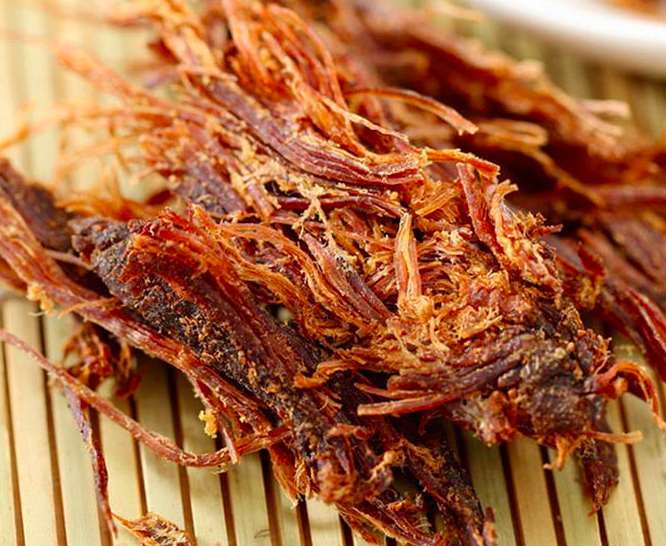 火燒干巴的吃法不復(fù)雜,不加任何輔料,不加任何味道,撕開肉絲即可食用。如果覺得干,可以涼拌一盤黃瓜輔之,風(fēng)味更甚。剛燒出來的干巴,香且脆,味勻,擱置太久,會(huì)回軟,失去其原有的香脆可口的口感。