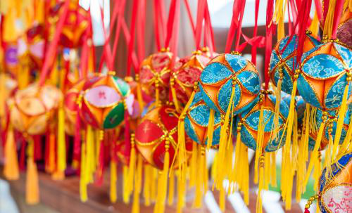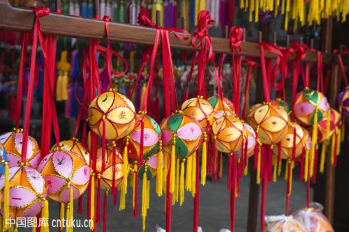 壯族繡球的制作工藝流程主要有:漿布——球面貼面——球瓣剪裁——球面描圖——球面刺繡——球瓣對折縫合——球瓣填充——縫合球瓣——球瓣合成——成品裝飾。靖西繡球的美主要體現在造型結構、刺繡紋樣和色彩組合上。其造型結構特征體現了豐富的形式美感,一是形體的融合統一,二是整體的對稱均衡。其刺繡紋案體現了精湛的手工技藝,如傳統紋飾只要為動物紋和植物紋兩類,動物紋只要有龍、鳳、鴛鴦、喜鵲、仙鶴、蝴蝶、魚等,植物紋主要有梅、蘭、竹、菊、松樹、牡丹、水仙、荷花等,另外也有人物繡,如八仙過海等。繡球 的精美炫目,跟大膽豐富的色彩組合有很大關系,靖西繡球強調色相強有力的對比張力和視覺刺激性,用高純度的色相進行強烈對比,凸顯了極富裝飾性而又高度和諧統一的色彩搭配原則。