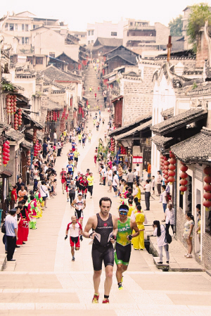 此次活動最大的亮點是傳統(tǒng)古老的“非遺”文化和劃騎跑三項挑戰(zhàn)賽緊密結(jié)合,充分利用黎平生態(tài)資源設(shè)置比賽線路。比賽全程131.5公里,途經(jīng)德鳳、高屯、巖洞、茅貢、壩寨等5個鄉(xiāng)鎮(zhèn)(街道)。兩天時間內(nèi),選手們穿行在黎平最亮麗的精品旅游示范區(qū)域——“百里侗寨”文化體驗走廊,穿越古木參天的森林,探秘古樸神奇的侗寨,感受清新秀麗的茶園,經(jīng)過滿載美妙愛情故事的風(fēng)雨橋,逐浪于綠如翡翠的三什江,奔跑在侗家如詩如畫的田野間,路過桂花臺、五里橋、東風(fēng)林場等多個著名景點,在侗鄉(xiāng)黎平的多情山水和旖旎風(fēng)光中追尋健康、快樂。身著民族服裝的侗族姑娘、小伙兒,在賽事最精彩的發(fā)令、節(jié)點交接、終點沖刺階段各個環(huán)節(jié)都唱起侗族大歌助興,“掠過古夢邊緣的旋律”讓這項國際性的現(xiàn)代化賽事洋溢著濃濃的“中國風(fēng)”。