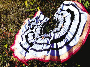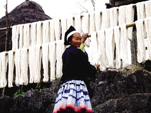 白褲瑤服飾的面料都是老阿婆手搖紡車,把一捆捆棉麻用勤勞智慧的巧手紡織成細(xì)紗,合著穗捻成勻稱的線。阿妹們再將線繞到線筒上,然后輕涮漂洗,繞到高腳糧倉下。線晾干后進(jìn)行紡織,一塊塊自紡的棉紗土布就形成了,之后就可以在這塊布上盡情“作畫”了。