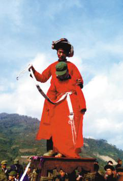 “跳五臺”可算是儀式中較為引人注目的。在村邊的一塊場地中央搭好一座約兩米高的木臺,叫做“五臺”。受戒的弟子們同樣帶著草帽,身穿紅袍,由師父帶領走向五臺。在鑼鼓聲中,繞五臺三圈,繞畢盤腿坐好。師傅叫到誰,誰就起來,在師父的指引下,沿木梯爬上高臺。蹲在五臺上的受戒者,雙手十指交錯,小心翼翼地向后移動到桌邊,然后翻落于藤網(wǎng)之中,由網(wǎng)中的棉被將受戒者包住。師父掀開棉被,見受戒者十指仍然穩(wěn)扣,坐像端端正正,表示度戒成功。十幾位弟子輪番上臺,每位都順利通過。受戒弟子的父母和鄉(xiāng)親們都為他們的成功而歡喜。