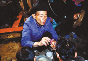 這天,我們剛好在縣里采訪,聽說高良鄉(xiāng)瑤族村寨要舉行度戒活動,于是就直奔瑤寨而去。一進寨子,馬上感覺氣氛不同。瑤族婦女們頭戴別致的大銀盤,身著盛裝,真像過節(jié)一樣。經(jīng)了解后,得知寨子里共有十幾個男孩要參加這次度戒。寨子里的一位老人告訴我們,一般情況下,只是兩三人,這樣多的男孩一同舉行度戒儀式是很難碰到的。看來,我們的運氣還真不錯。我們來到度戒地點,見到將要度戒的十幾個男孩集中在一起,用棉被蒙著頭,不能見陽光,要等儀式完后,才能見陽光。