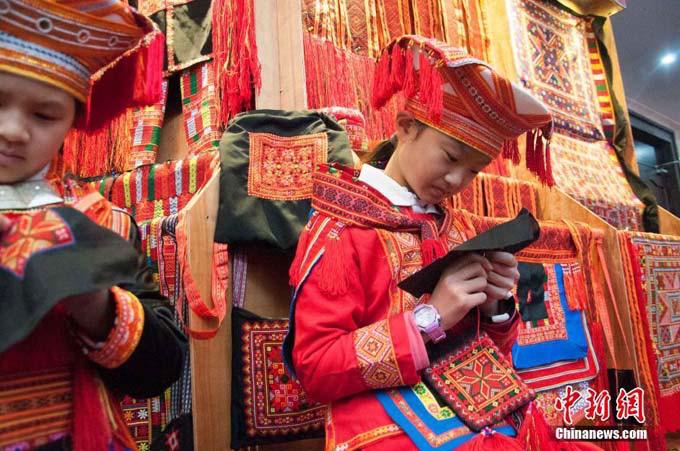 12月6日,在中國(guó)瑤族之鄉(xiāng)廣西金秀瑤族自治縣的盤王節(jié)上,當(dāng)?shù)乩弦惠叕幾鍕D女展示瑤族織繡