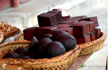 逢年過節(jié)或來了至親好友、土家人的餐桌上往往會擺上一碗血豆腐。血豆腐是土家族傳統(tǒng)菜。用新鮮的豆腐加上干凈的豬血,拌以食鹽、辣椒、花椒、桔皮、肥肉末,用手捏成塊狀,放在柴草煙上熏烤,以表面稍黑,內(nèi)質(zhì)稍硬為度。食用時可以切成薄片,加以豬肉爆炒,也可以切成細絲,加上辣椒、香蔥炒制。入口時,令人覺得清香酥軟,大開胃口,是一道下酒佐食的佳肴。