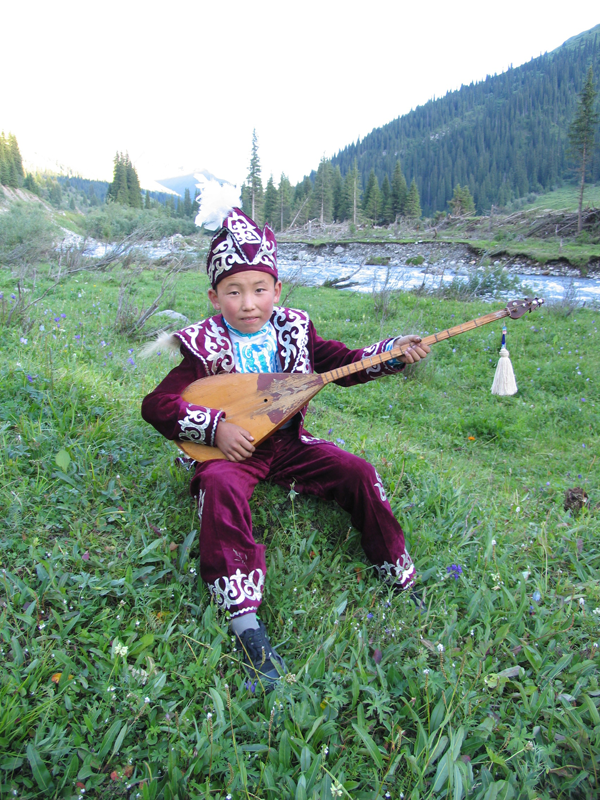哈薩克族的音樂極具民族特色,樂器種類和樂曲形式也非常豐富。“冬不拉”為彈奏樂器,是哈薩克族民間最流行的傳統(tǒng)樂器,分為高、中、低等十幾種。冬不拉易學易帶,深受廣大哈薩克族人民的喜愛。拉奏樂器以“柯布孜”為代表,演奏起來聲音類似小提琴,但形狀要比小提琴復(fù)雜,其上端向里彎,琴腹如勺,腹面張開,背面蒙有羊皮,琴弦是用馬尾或牛筋制做而成的。吹奏樂器主要有“斯伯孜俄”,民間藝人喜好并擅長使用此物,被哈薩克族譽為“心笛”。這種樂器外形酷似豎簫,音色悠揚而柔和。哈薩克族的打擊樂器也有很多,極有特色的是“阿迪托亞克”。這種打擊樂器由兩個組成一對,演奏時互相擊打,其外形似馬蹄,加之所奏出的效果也像馬蹄踩在地面上的聲音,哈薩克族稱之為“馬蹄音”。