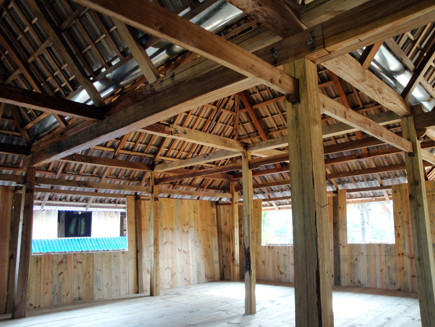 德宏瑞麗一帶的竹樓由“干欄”和平房兩部分組成,“干欄”是住房,平房是廚房。“干欄”多為長方形,下層架空,可堆放雜物。上層做橫向分割,成一間堂屋和數(shù)間臥室。堂屋中設(shè)有火塘,一般用于燒茶,在一角設(shè)有佛龕。堂屋外有開敞的前廊和曬臺。屋頂為歇山式,脊長,坡面平緩,外墻開窗,有的還是落地窗,墻與屋頂之間有縫隙,這些都加強了室內(nèi)空氣的流通,達到了室內(nèi)陰涼的效果。