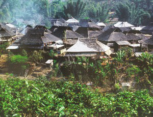 云南西雙版納傣族村落。傣族的典型村寨主要在西雙版納傣族自治州和德宏傣族景頗族自治州的平原上,但形制不同。西雙版納的傳統(tǒng)住房以“鳳凰展翅”的竹樓著稱,就是人們常說的干欄式建筑。由于竹材易遭白蟻,翻建頻繁,上世紀70年代已陸續(xù)改用竹木結構,屋頂覆緬瓦。即木料做房架結構,采用卯榫結合,竹材用于檁、椽、樓面、擋墻、欄桿等。