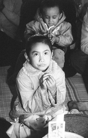 看到玉波家賧奉的物品一份份的被人領(lǐng)走,我所關(guān)注和等待的是看哪個小和尚能得到玉波的“薩拉帥”。因為按這里的習(xí)慣,凡得到“薩拉帥”的小和尚一般都會和小女孩交上朋友或認做兄妹,成為終身的精神依托,有的還會結(jié)為夫妻。誰會得到玉波的這份“薩拉帥”呢?我在想。這時,玉波的爺爺興沖沖地走來,告訴家人說:“薩拉帥賧給了’帕召’(傣語:佛祖。“帕”從字面來理解是“僧人”,但其含義實質(zhì)上多指“有?!?,“召”,是王之意。連起來“帕召”就是“有福之王”)?!痹瓉恚癫ǖ摹八_拉帥”分在了給佛祖的那份里。這可是最高級別的賧奉了,我從她全家人格外高興的臉上看出了這一點。這似乎預(yù)示著玉波的一生將會得到佛祖的特別關(guān)照!