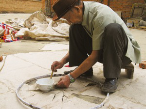 言談間,巖妞把制好的竹環(huán)放入早已畫好的同心圓圖案中的小圓上,只見竹環(huán)大小正好與小圓吻合。巖妞說,圖案外側的大圓便是擺放棉紙用的。接著,他把手中厚厚的幾張棉紙圍繞著已經放入圖案中的竹環(huán)依次擺入,直至擺滿。在同心圓圖案的上側,巖妞還畫了一個寬與同心圓圖案的直徑相符的矩形圖案,把棉紙鋪滿其中。巖妞說,這圖形就是“貢菲”的高度。制作的最后一道程序,是把棉紙用漿糊粘合起來。陰干后,一個“貢菲”就做好了。