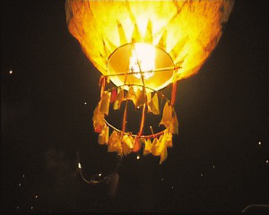 燃放“貢菲”,需要多人幫忙。首先要用火把點燃牛油等制成的燃料,讓孔明燈內充滿熱氣,等到它直立向上沖的時候,大家一齊放手,孔明燈就飛向高空。隨著燈底圓口處的明火繼續(xù)燃燒,孔明燈越飛越高,燈內攜帶的鞭炮不時發(fā)出噼噼啪啪的響聲,仿佛在祝福傣鄉(xiāng)人民吉祥如意、幸福安康。