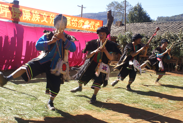 節(jié)日里,婦女們穿著鑲花邊的黑色上衣和點(diǎn)綴著各種銀飾物的花裙,佩戴耳環(huán)、項(xiàng)鏈等首飾,風(fēng)采奪人。男人穿著麻布短衣褲,腰系紅黃長帶,小腿系吊簡,腰佩長刀,肩挎箭包,英姿勃勃。節(jié)目的廣場上,堅(jiān)趄兩根二十米高的樹干,四周用藤蔓拉緊固定,樹桿上插有三十六把明晃晃的長刀,作為向上攀登的橫檔,刀刃向上,寒光逼人,謂之“刀竿午間。鞭炮齊鳴,鑼鼓震天”。身穿大紅抱、頭纏紅布包頭、赤腳的五名“玩火者”,齊涌至竿下,圍繞刀竿唱歌跳舞,將斟滿的白酒一飲而盡,縱身飛上刀竿。雙手緊提刀面,運(yùn)足氣的腳掌斜置在鋒利的刀刃上,勇敢、靈巧地向上攀登。全場鴉雀無聲,大家屏住呼吸仰面觀看,對(duì)他們的氣功絕技贊嘆不已。噼噼啪啪的鞭炮聲來自竿頂優(yōu)勝者,響徹云霄。全場歡呼跳躍,爭相向爬桿者敬獻(xiàn)美酒。對(duì)歌、跳舞、蕩秋千活動(dòng)為節(jié)日增添了濃郁的氣氛。丟煙包(煙盒)活動(dòng)別具一格,青年男女各站一方,互擲煙包,姑娘將小伙的煙包收藏起來,說明姑娘接受了小伙子的愛慕。