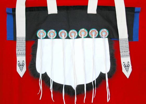 七星披肩所用材料為黑色綿羊皮,先將羊皮去毛、洗凈、硝白、縫成披肩,然后在披肩背上繡上自己縫制精美的七顆星星,每個(gè)星星中心垂下兩條布帶,整個(gè)布帶與白色寬帶相繞,帶梢端垂于后,披肩的兩角釘上兩條白布帶,勞動(dòng)時(shí)拉到胸前交叉系緊?!边@樣一件精美的“披星戴月衣”是對(duì)勤勞的納西族婦女的歌頌,形如蛙身狀的披肩是古代納西族圖騰崇拜的標(biāo)志,在納西族傳統(tǒng)中,青蛙是智慧之神,反映了納西族在美學(xué)、習(xí)俗等方面形成的傳統(tǒng)觀念和心理特征。