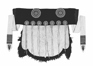 剪裁時,將羊皮修剪成U型,上部橫鑲一段黑氆氌(毛織品)或黑呢子,內(nèi)襯天藍(lán)色棉布。其下用七對白色鹿皮條穗縫綴并列的七個小圓形彩線繡花布盤,肩部縫綴兩個大圓形彩線繡花布盤。羊皮上端縫釘兩條繡花白布長帶,帶端還繡有花鳥、魚蟲、動物、植物、幾何等圖案,據(jù)說是象征納西族人民如蜂似蝶地奔忙,以辛勤勞動換取甜蜜生活。