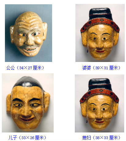 面具,土族語稱“面古子”,是土族在表演某些儀式舞蹈時用以表現(xiàn)一定內(nèi)涵的道具。按形制可分為假面和假頭兩大類。其中最具代表性的當(dāng)屬“納頓”節(jié)日當(dāng)中使用的面具。民族文化宮博物館珍藏了三組土族“納頓”面具,分別為表演“莊稼其”時的公公、婆婆、兒子、媳婦的假面面具;表演“殺虎將”時的殺虎將、虎、猴、牛的假面、假頭面具;表演三國演義人物關(guān)羽、張飛、曹操、呂布的假面面具。面具材質(zhì)均為布胎, 20世紀(jì)80年代征集于青海省海東市民和回族土族自治縣。